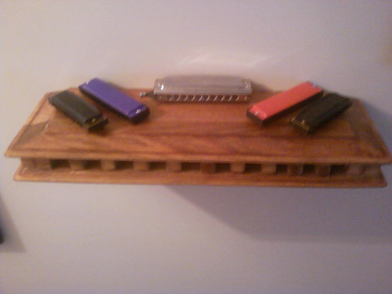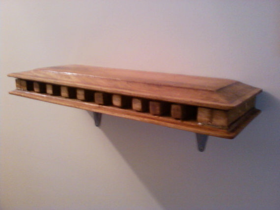 Today, it’s about a shelf.  A wooden one, in fact.  I came across an Etsy shop called Musical Shelves that sells wall shelves inspired by the shapes of musical instruments.  There’s a banjo and a guitar that are pretty clever, but the harmonica shelf wins the day for me.  Though the metal brackets he shows it with are a bit unfortunate, the shelf, itself, is a really smart bit of woodworking and a really interesting wall piece.  I’d love to have one of these in my entryway to hold my harmonicas and keys.  Or I’d like to think that those openings in the front of the shelf are just the right size to slide a harp into. Great little piece.  Like a functional piece of art guaranteed to add convenience and conversation to any home.