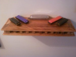 Dude…love the harmonica shelf. I’m doing something similar. We use a traditional mantel mount to hide the mounting method. We use it on a wall mounted bicycle holder…good for holding about 50 lbs. on an 18 inch long shelf. Essentially just a 2×4 cut in half lengthwise at a 45 degree angle, and mounted to wall studs.